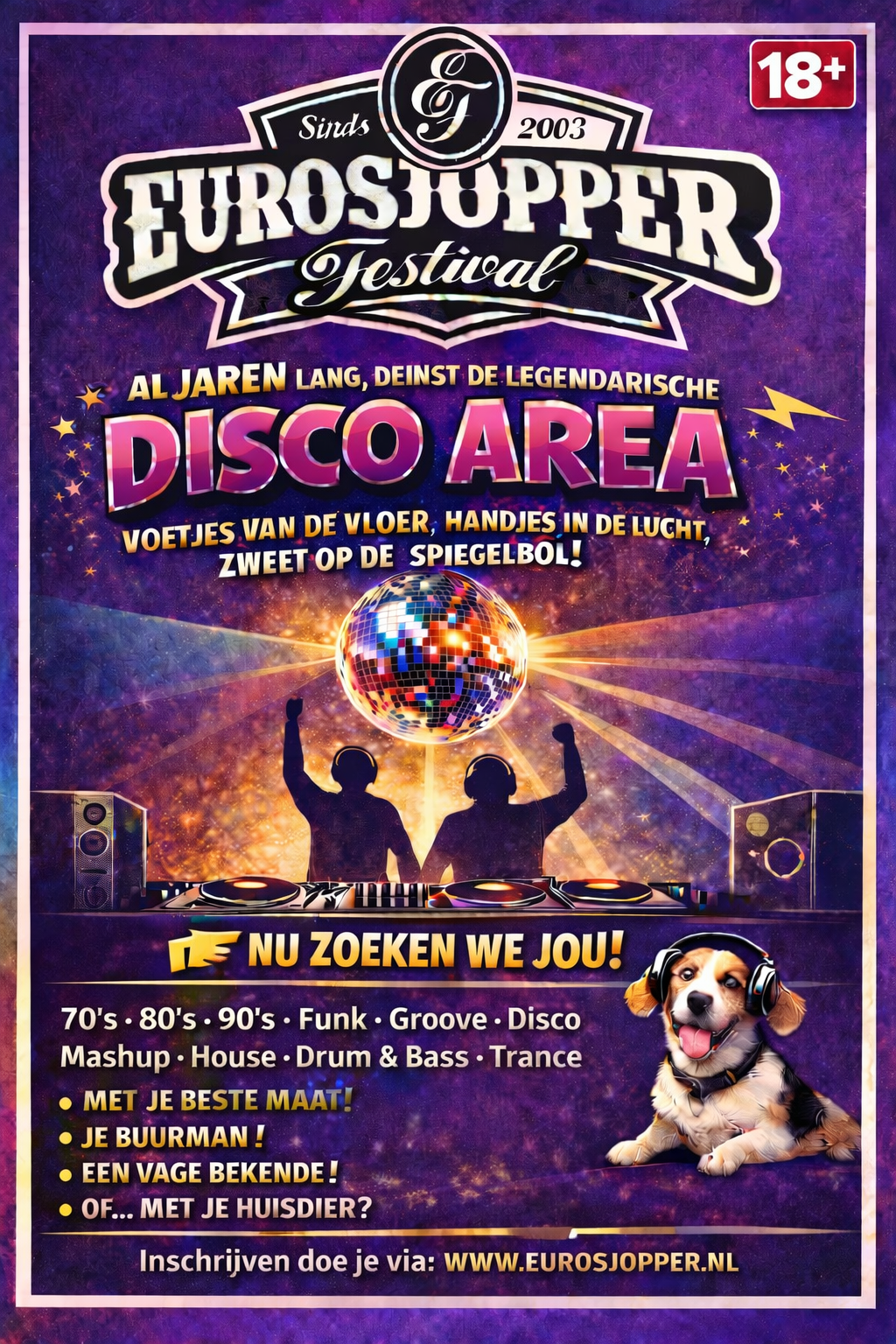 EUROSJOPPER FESTIVAL ZOEKT DJ’S! Al jarenlang, deinst de legendarische DISCO AREA. Voetjes van de vloer, handjes in de lucht en zweet op de spiegelbol